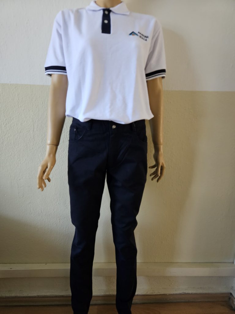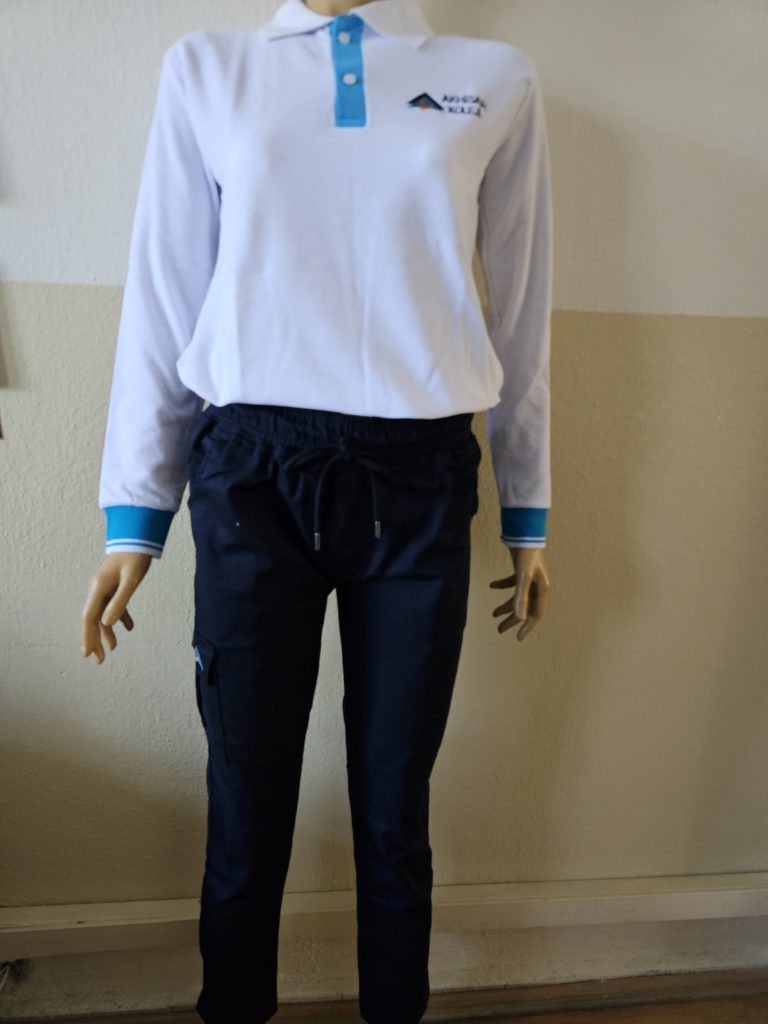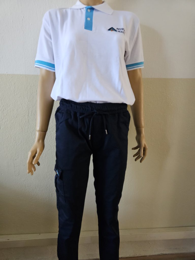 Kış Kıyafeti : Kargo tipi lacivert pantolon – Polo yaka okul amblemli beyaz uzun kollu tişört-