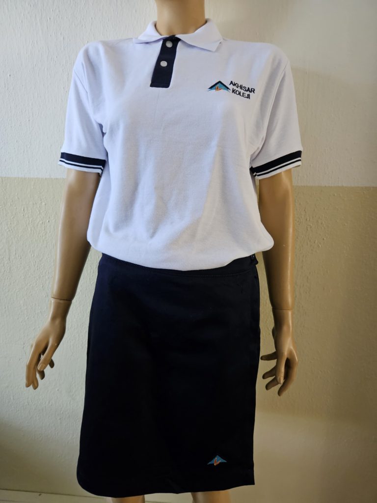 Yaz Kıyafeti : Lacivert okul amblemli şort etek- Polo yaka beyaz kısa kollu okul amblemli tişört
